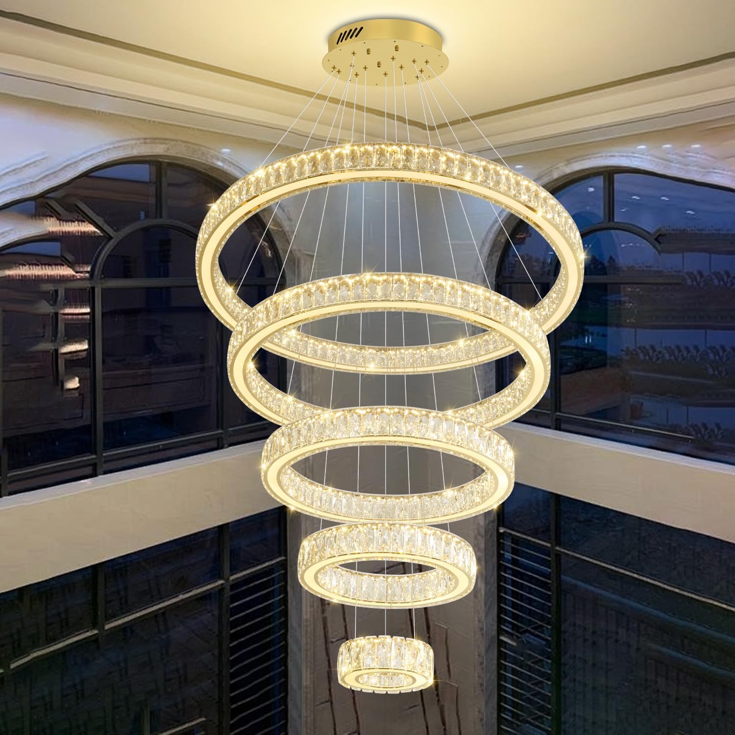 Gold 5 Ring Chandelier for High Ceiling Modern Crystal Hanging Chandeliers Flush Mount Ceiling Light for Spiral Staircase Entryway Foyer, D8″-16″-24″-32″-40″