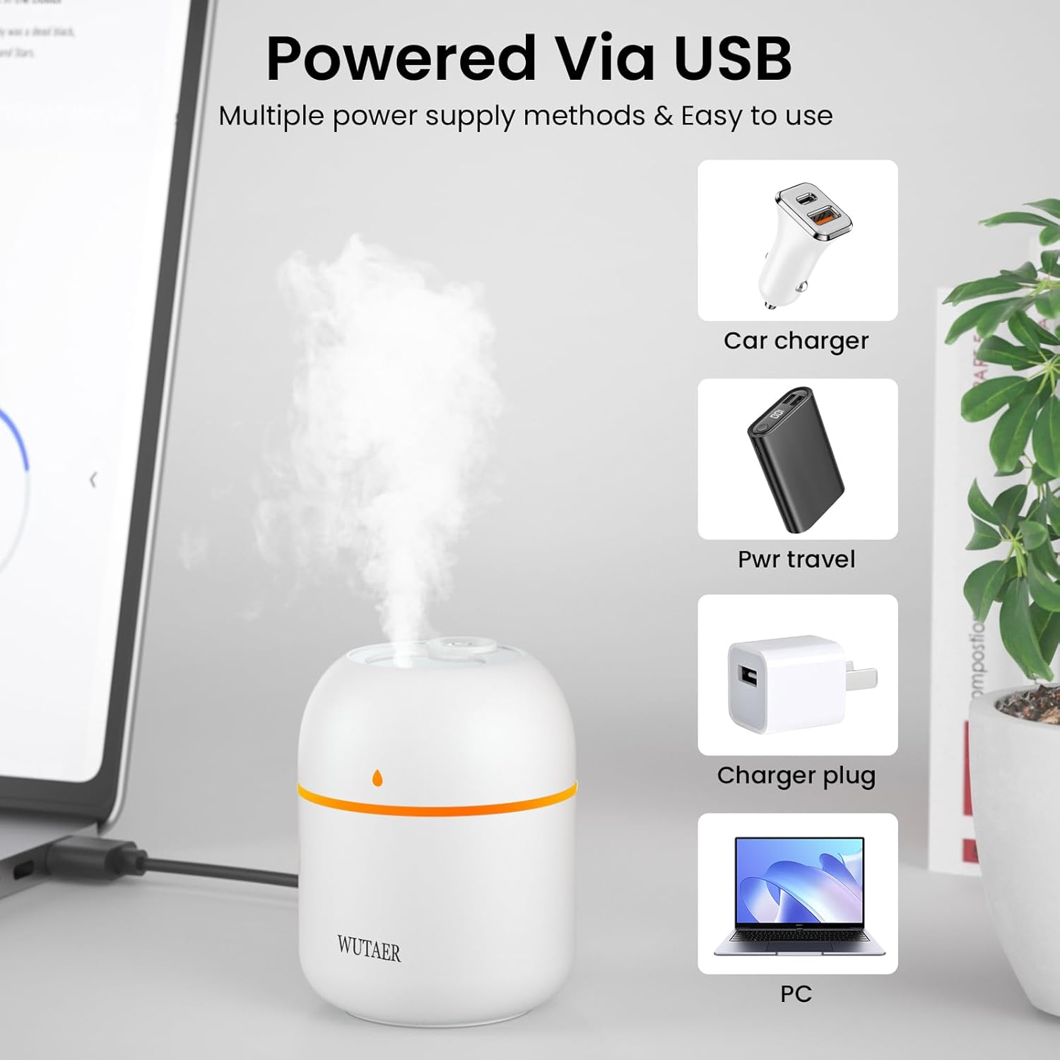 𝐏𝐨𝐫𝐭𝐚𝐛𝐥𝐞 & 𝐂𝐨𝐦𝐩𝐚𝐜𝐭: Take this mini humidifier anywhere – perfect for bedrooms, offices, and cars. Its soothing night light feature adds a peaceful ambiance, enhancing your sleep quality. Notice: Please ensure the humidifier operates on 5V and draws no more than 1A. Using a higher voltage power supply may shorten the product’s lifespan or cause damage. (No adapter is provided in the package. The product cannot be charged and needs to be powered via USB to work properly.)